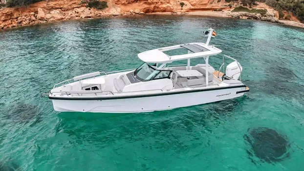 Die Axopar 29 ist ein Premiumboot für stilvolle Fahrten, starke Leistung und komfortable private Ausflüge entlang der Küste von Mallorca. Der Start erfolgt in Puerto de Alcudia, ideal, um die Nordküste der Insel mit viel Platz, Eleganz und praktischer Ausstattung zu entdecken. Mit 9,5 Metern Länge, 2,8 Metern Breite und Platz für bis zu 9 Personen bietet sie ein elegantes Layout für einen ganzen Tag auf dem Meer und erreicht bis zu 40 Knoten.