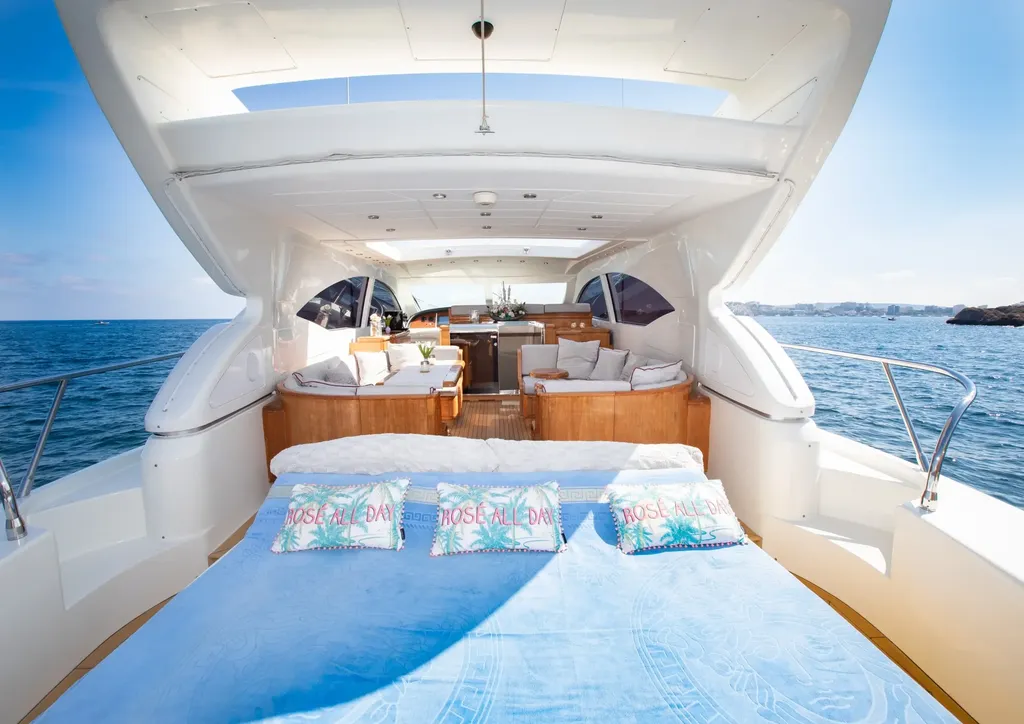 This yacht also includes captain and stewardess, which adds comfort and service throughout the day. For guests who enjoy spending time in the water, it includes paddle surf, snorkelling equipment and an exclusive anti-jellyfish pool, making it especially attractive for families and groups who want both relaxation and fun during the charter. Additional watertoys can also be arranged on request.