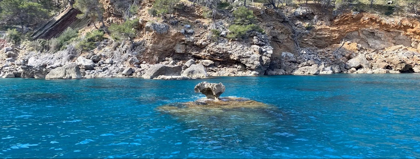 Mushroom Bay, conocida localmente como Cala Roja, se sitúa en la costa noroeste de Mallorca y destaca por el tono rojizo de los acantilados que la envuelven, creando un contraste singular con la transparencia del agua. Sin playa como tal, la cala se abre como un pequeño refugio rocoso de aguas limpias y fondo arenoso, donde la visibilidad es excepcional. En el centro de la bahía, una formación rocosa con forma de hongo da nombre al lugar y actúa como punto focal tanto visual como marino.