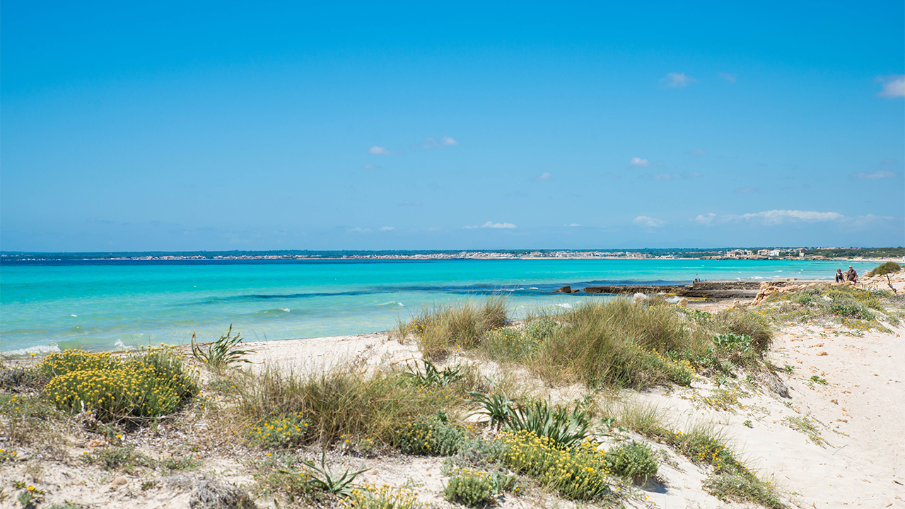 Es Trenc se despliega en el litoral sur de Mallorca como una de las últimas grandes extensiones de costa virgen de la isla, con una línea ininterrumpida de arena blanca y aguas de un azul casi translúcido. Sin edificaciones en su entorno inmediato, el paisaje conserva una lectura esencial del Mediterráneo: dunas suaves, salinas en el interior y una sensación de amplitud que se percibe incluso antes de llegar a fondear. Desde el mar, la playa aparece como una franja luminosa, abierta y silenciosa, donde el horizonte se expande sin interrupciones.