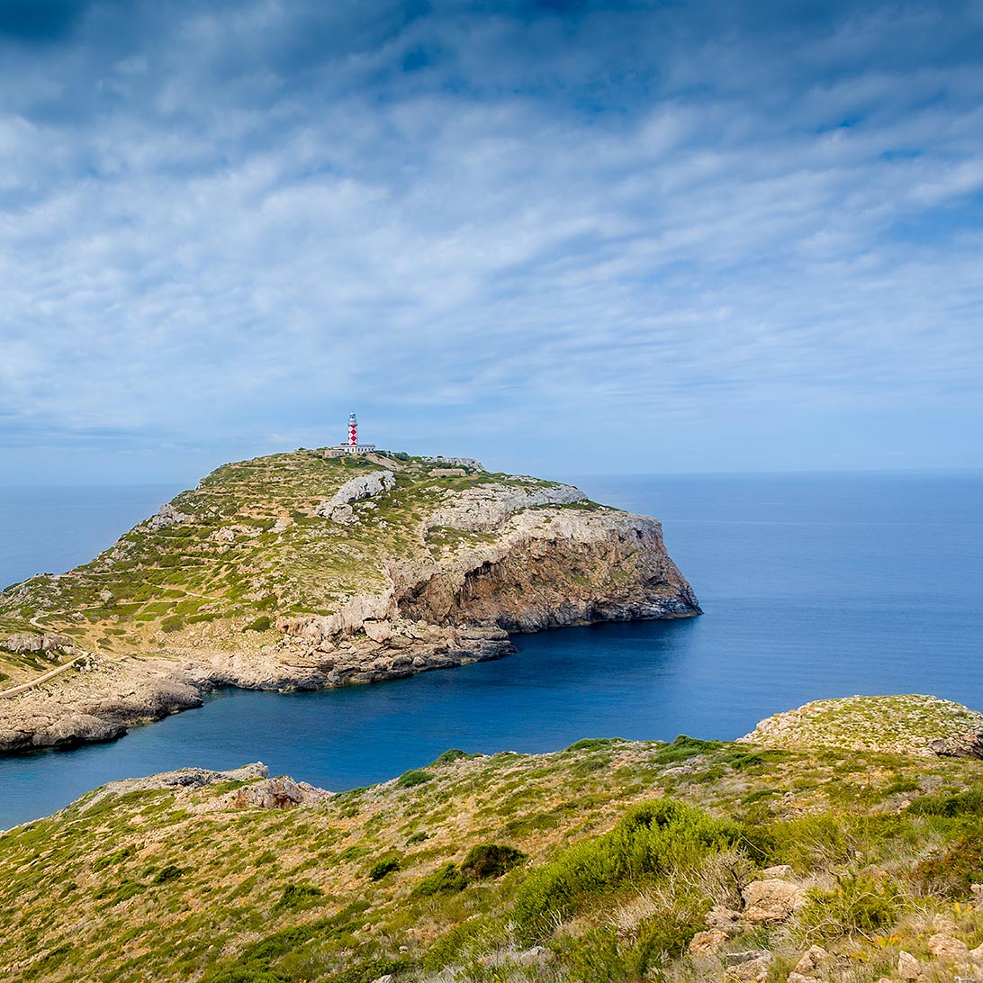 Isla Cabrera se encuentra frente al extremo sur de Mallorca y forma parte de un archipiélago protegido dentro de un parque nacional marítimo-terrestre. Su silueta emerge del mar como un territorio intacto, donde la naturaleza se mantiene prácticamente inalterada: costas abruptas, calas de agua cristalina y una vegetación baja que refuerza su carácter salvaje y aislado. Desde la navegación, la isla aparece como un punto de referencia suspendido en el azul profundo del Mediterráneo, con una presencia silenciosa y monumental.