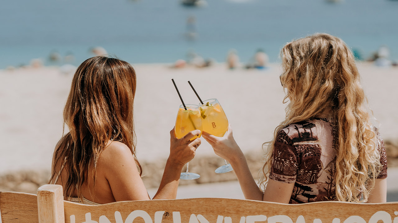 Acceder desde el barco es parte del ritual: el servicio de dinghy permite desembarcar directamente en el beach club, integrando la llegada en la propia experiencia. Durante el día, la música del DJ marca el ritmo entre cócteles, baños de sol y largas sobremesas frente al mar; al atardecer, el ambiente se transforma en un escenario más íntimo, donde la luz dorada y las vistas sobre la bahía de Palmanova definen un cierre más sereno. Beso Beach es una parada que equilibra perfectamente energía y desconexión dentro de una jornada de charter en Mallorca.